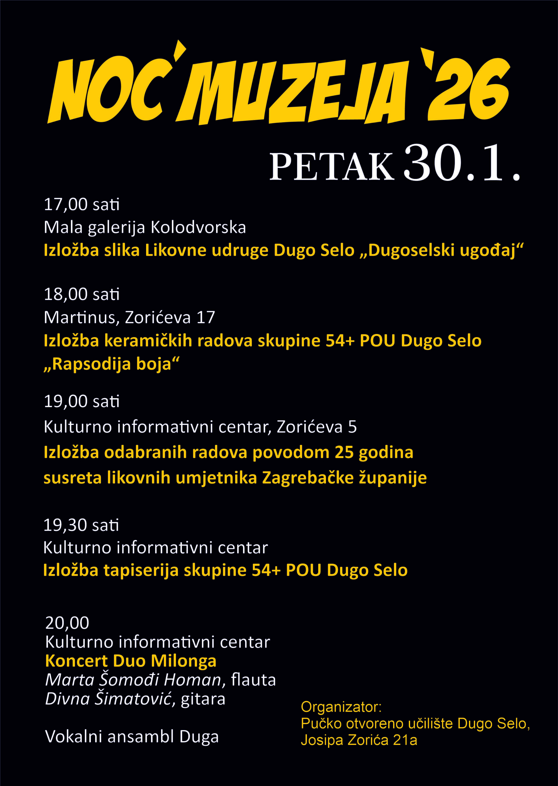 Noć muzeja u Dugom Selu donosi večer ispunjenu kulturom, poviješću i druženjem! U srcu grada, posjetitelji će imati priliku istražiti bogatu lokalnu baštinu kroz izložbe, radionice i zanimljive programe za sve generacije.